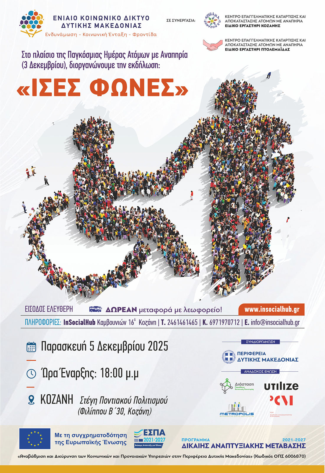 ✅️ «ΙΣΕΣ ΦΩΝΕΣ» Εκδήλωση για την Παγκόσμια Ημέρα Ατόμων με Αναπηρία 🔸️ Στο πλαίσιο της Παγκόσμιας Ημέρας Ατόμων με Αναπηρία που εορτάζεται σήμερα (3️⃣ Δεκεμβρίου), η Περιφέρεια Δυτικής Μακεδονίας και το Ενιαίο Κοινωνικό Δίκτυο, σε συνεργασία με τα Κέντρα Επαγγελματικής Κατάρτισης και Αποκατάστασης Ατόμων με Αναπηρία (Ειδικά Εργαστήρια Κοζάνης και Πτολεμαΐδας), διοργανώνουν την εκδήλωση “Ίσες […]